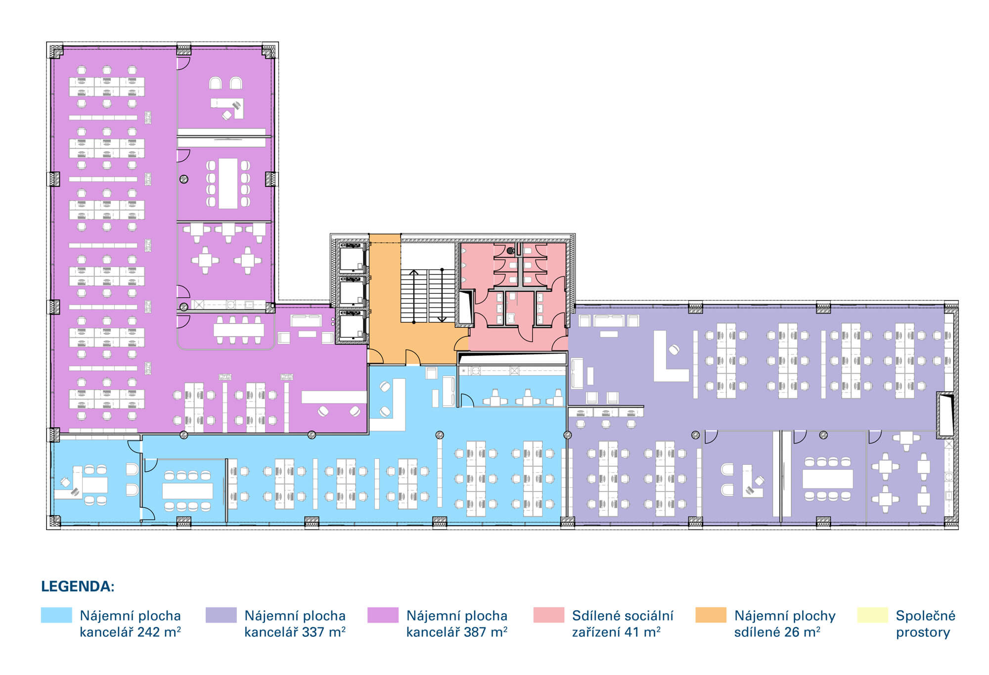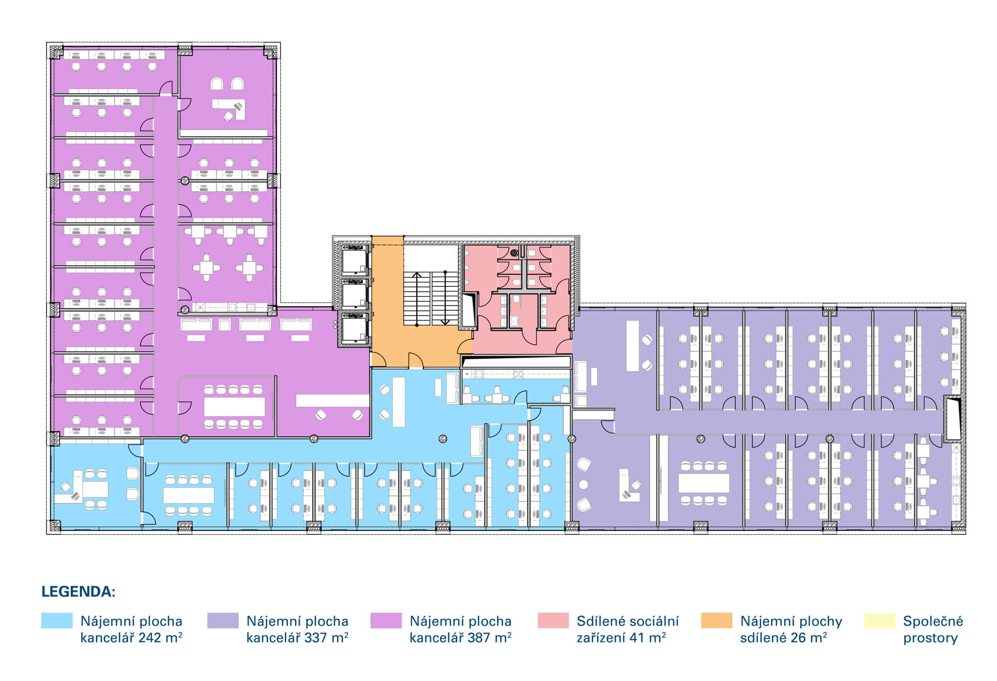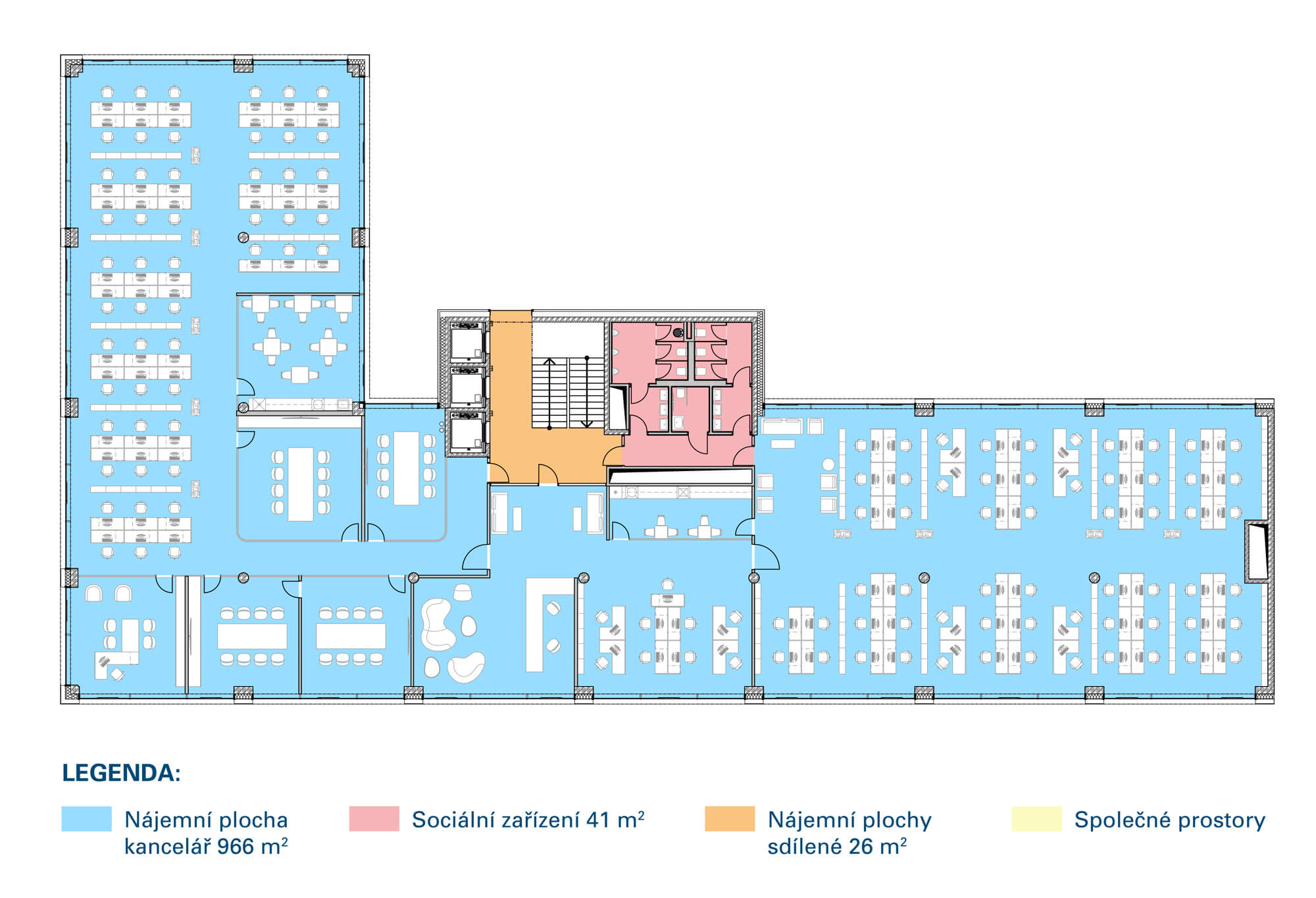 Vzorová dispozice – 3 nájemci – koncept velkoprostorová kancelář