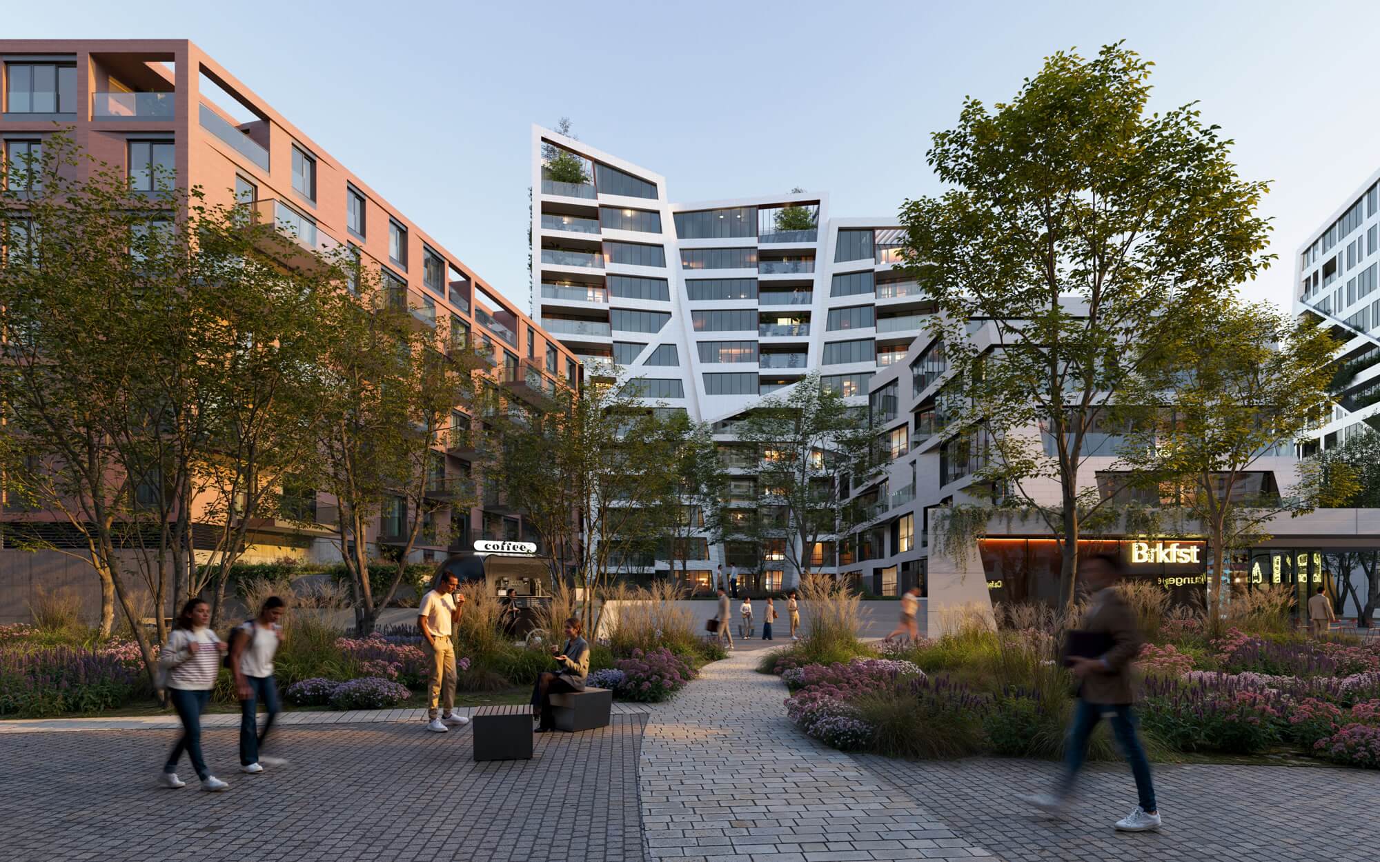 Veřejný prostor budou rámovat čtyři unikátní rezidenční objekty Sekyra Flowers . Každá z budov bude „vzkvétat“ ve formě třech třpytivých útvarů , které působí zároveň organicky i geometricky. Věže se zelenými střechami budou obložené kovovými dlaždicemi, které budou zachycovat a odrážet světlo a tím evokovat dojem rozkvetlých květů. Sekyra Flowers budou zahrnovat byty všech velikostí – od malých studiových jednotek po penthousy s rozlehlými terasami.