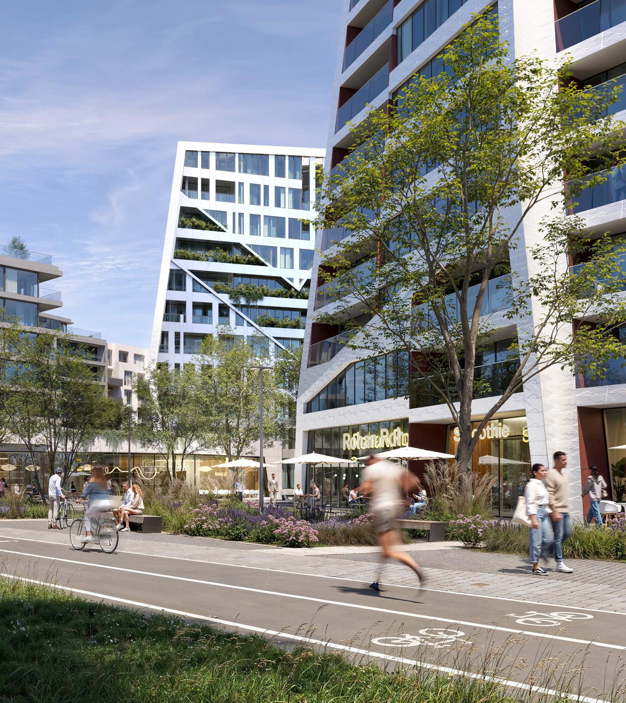 Rezidenční věže budou vymezovat prostor budoucího náměstí. Jedna z nich bude přímo sousedit s cyklostezkou a představovat tak symbolický vstup do celého území. V přízemí budov bude parter s retailovými prostory určenými pro restaurace, kavárny, volnočasové aktivity a služby. Další obchodní plochy budou lemovat centrální pěší osy a plynule navážou na cyklostezku. Tím se vytvoří příjemné prostředí pro obyvatele čtvrti Rohan City i její návštěvníky.